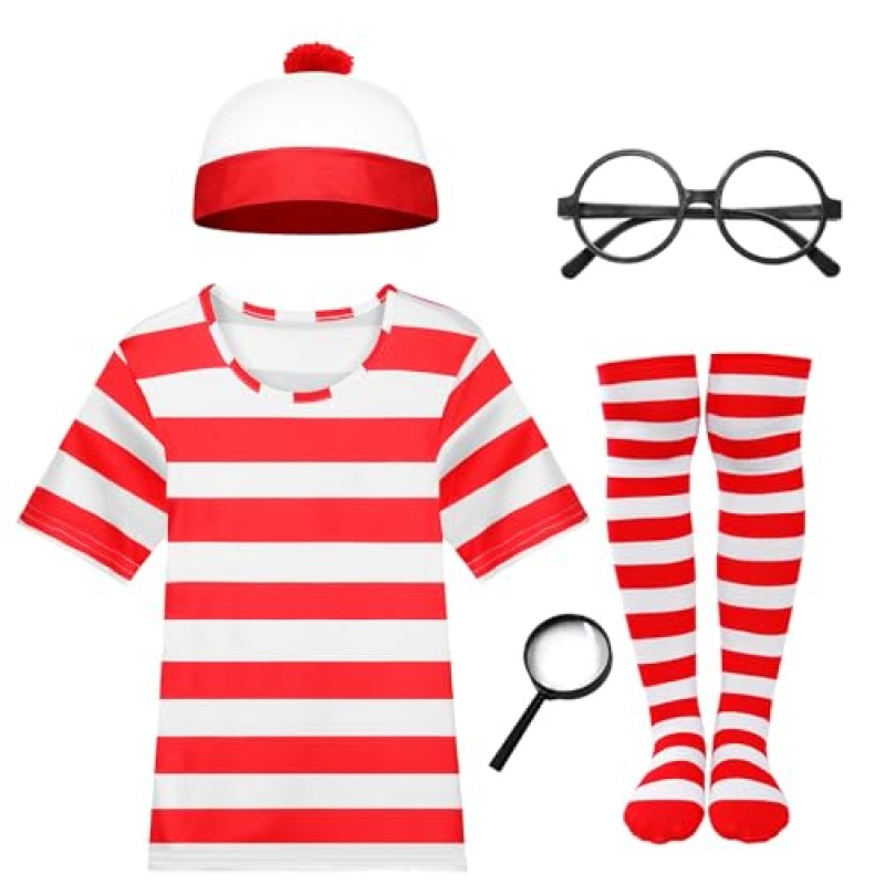 - Includes red and white short-sleeve T-shirt, bobble hat, round glasses, magnifying glass, and striped stockings – complete Wally ensemble for your Halloween quests.