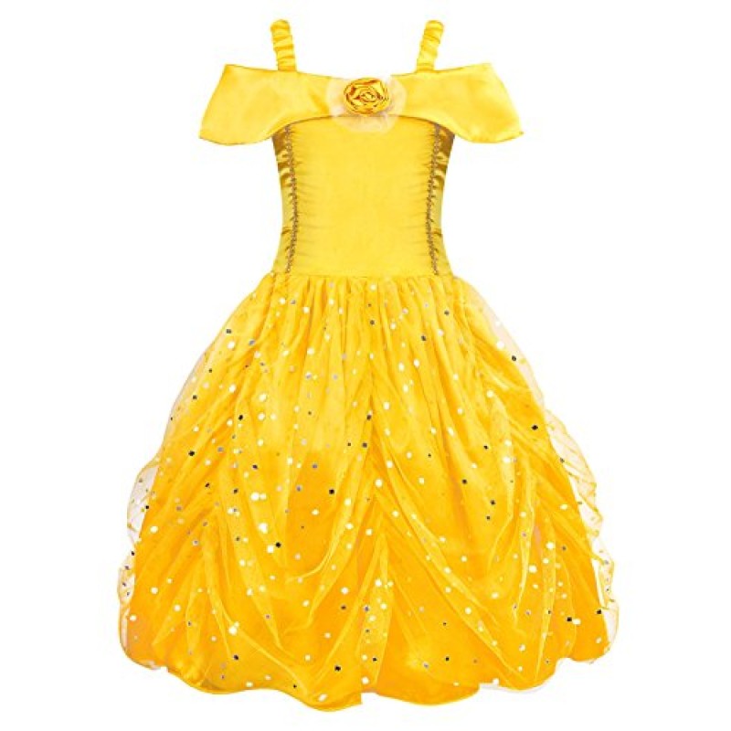 The glowing gold outer fabric dazzles with bright colours, complemented by a lace hem sprinkled with sparkling sequins, perfect for casting a spell of sparkle wherever your princess goes. Whether she’s attending a Halloween bash, a whimsical birthday party, or engaging in spirited cosplay, this dress conjures up the charm of classic princess tales, transforming every moment into a regal celebration. Gift your little one the joy of dressing up with this magical attire that turns any day into a bewitching fairy tale.