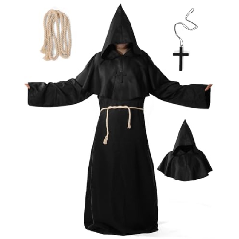 - Includes robe, hooded cape, rope belt, and cross necklace - all you need for a complete monk look