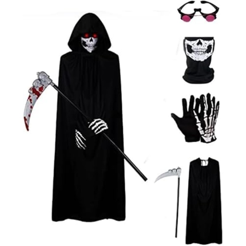 - Includes black cloak, glowing red eyes glasses, scythe, facewear, and gloves