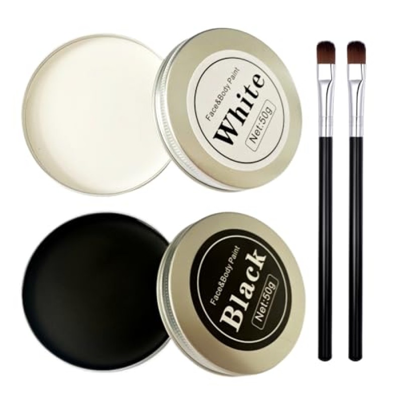 - Includes 50g jars of black and white face paint plus two application brushes – conjure up spooky designs with ease.