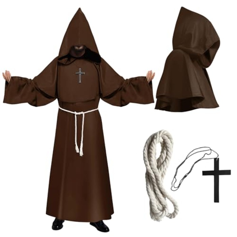 - Four-piece set: long cloak, gothic hood cape, cross necklace, and adjustable rope belt – assemble your mysterious monk ensemble.