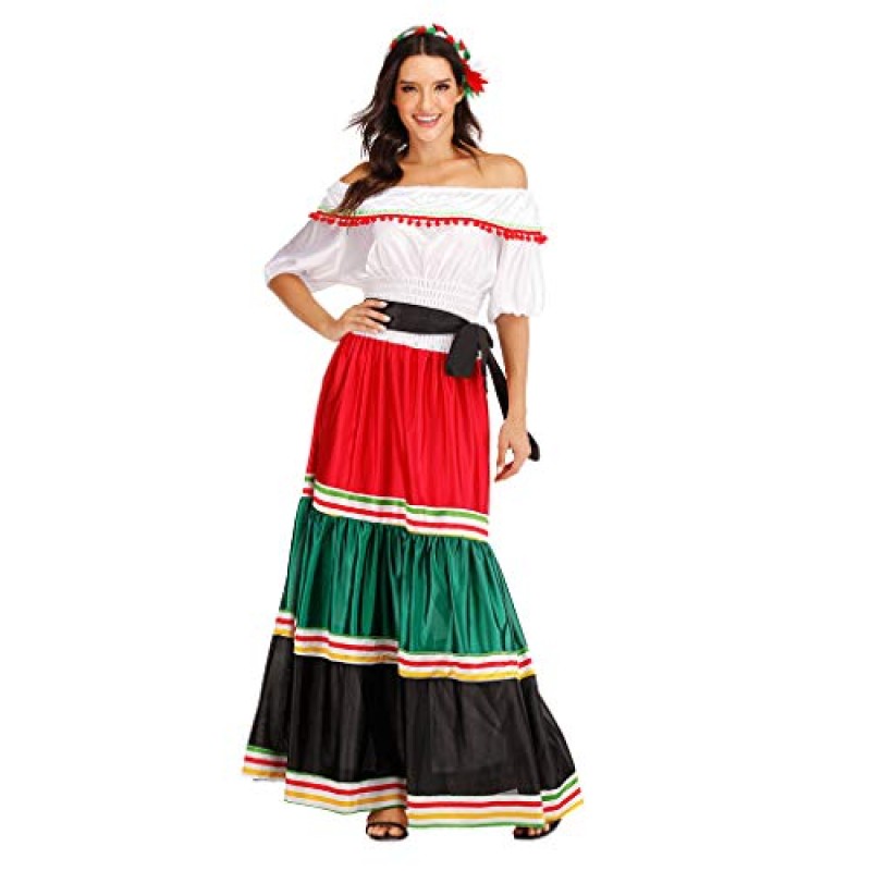 - Features vibrant red, green, and black stitched skirt, perfect for lively Mexican carnival vibes at Halloween.