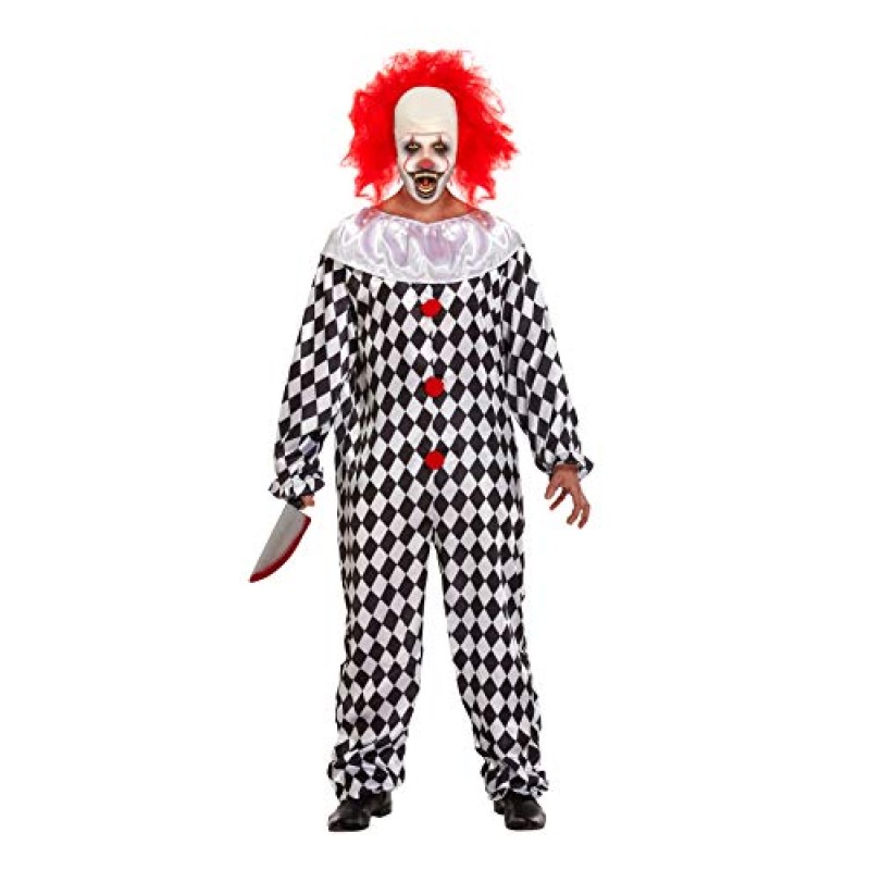Become everyone's worst nightmare with this scary clown costume! This adult's fancy dress outfit includes a satin-look bodysuit and a red wig (knife not included). Perfect for setting a spooky atmosphere at Halloween parties or while trick-or-treating. Combine it with fake blood, knives, axes, bloodied bandages, white face paint, or clown makeup sets for an extra terrifying look. Scare your friends and family with this chilling ensemble!