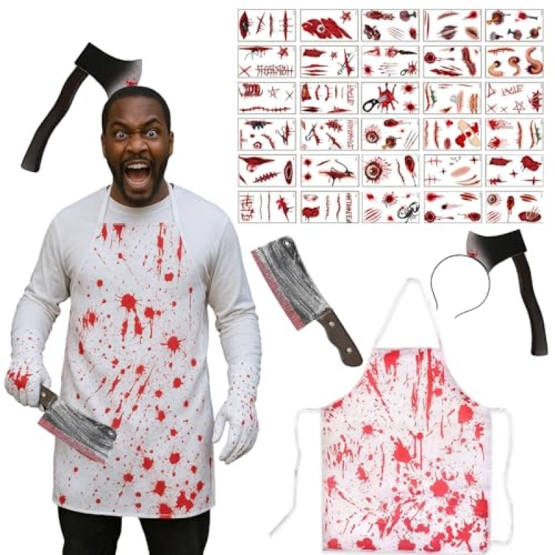 - Includes: 1 cutting knife, 1 axe hair band, 30 tattoos, 1 bloody apron