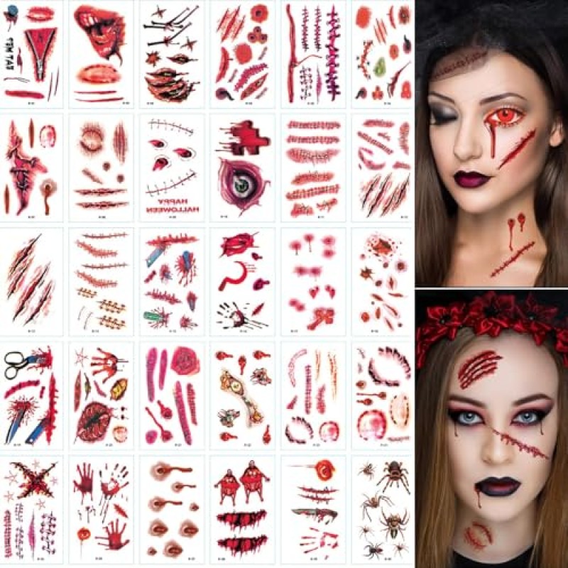 - 30 sheets of fake scar and wound tattoo stickers included for abundant spooky creativity.