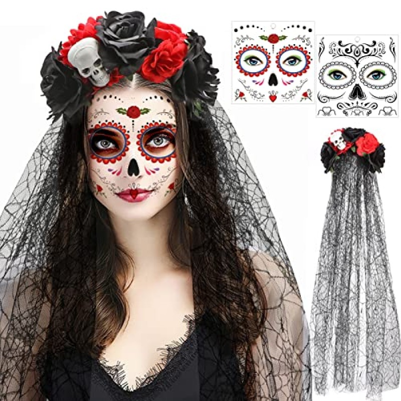 - Day of the Dead Headband: Features red and black rose florals, spooky skulls, and a veil made of comfortable polyester.