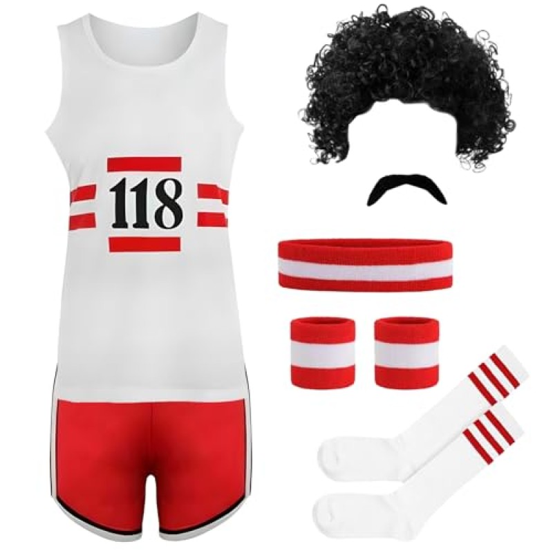 - Complete 7-piece set including vest, shorts, black wig, moustache, red & white socks, headband, and wristbands for a full marathon runner look.