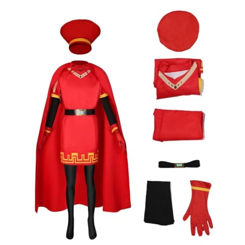 Step into the mischievous shoes of the diminutive yet mighty Lord Farquaad with this complete adult costume set. This regal ensemble conjures the unmistakable charm of the infamous king, featuring a vivid red robe, a flowing cloak, a stately hat, a belt, gloves, and pantyhose to bring your Halloween character to life. Crafted from soft, breathable polyester, the outfit ensures comfort as you command attention during your nocturnal escapades or fancy dress revelries.
