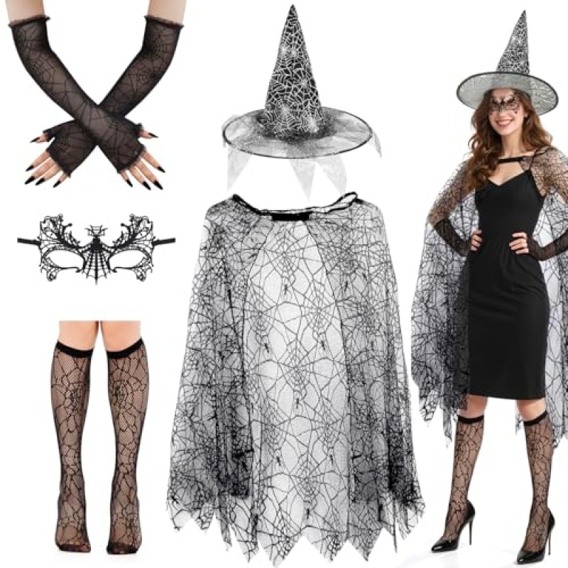 Kyndara Women's Witch Costume Set with Cape, Hat, Mask, Socks, and Sleeves