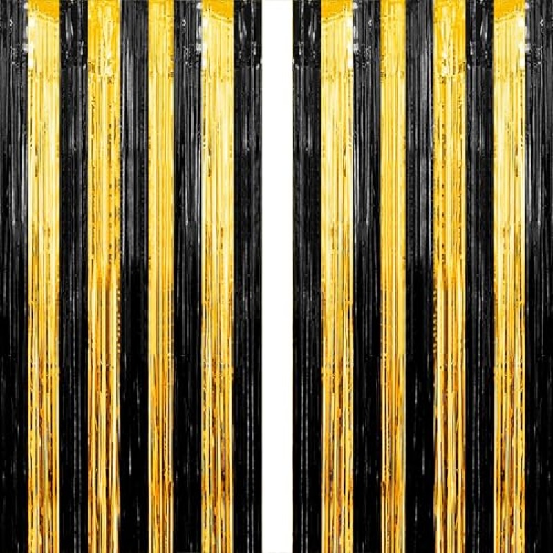 - 2-pack set of metallic foil curtains in classic black and gold – double the shimmer for spooktacular scenes