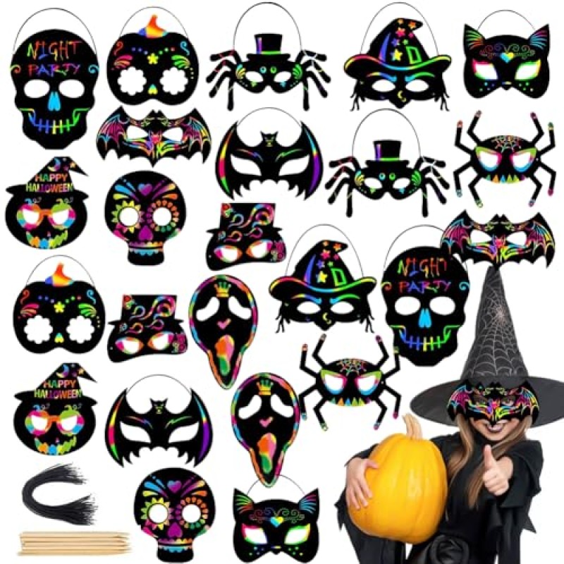- Includes 24 Halloween-themed scratch art masks featuring skeletons, witches, pumpkins, bats, cats, and spiders for a full menagerie of spooky fun.