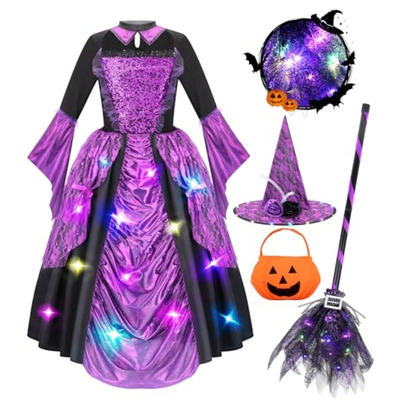 Meland Witch Costume with Light-Up Hat and Broom for Kids