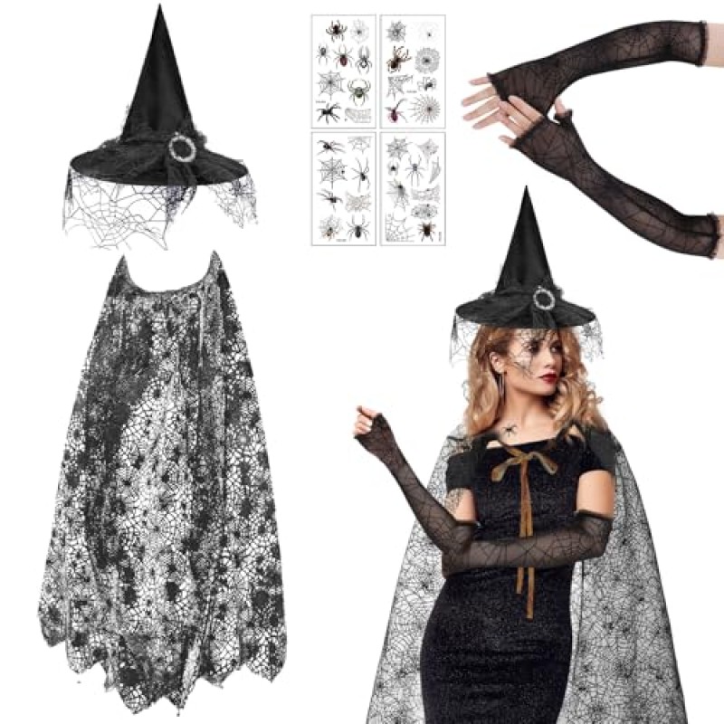 - Includes spider web cape, witch hat, lace long-sleeved fingerless gloves, and four spider tattoo stickers – complete your spooky look.