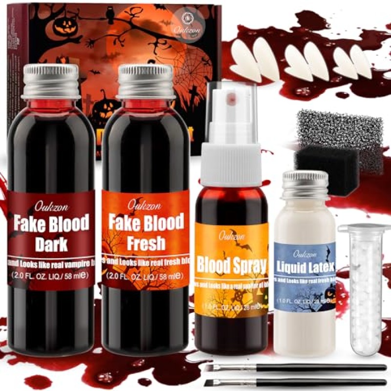 - Complete set includes dark blood, fresh blood, blood spray, liquid latex, sponges, brushes, vampire teeth in three sizes, and adhesive – all you need for spooky SFX makeup.