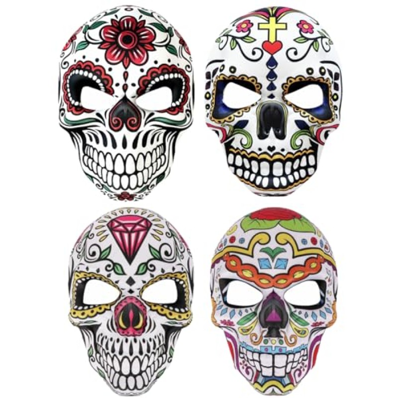 - Set of four unique full-face sugar skull masks, ideal for group costumes or varied styling