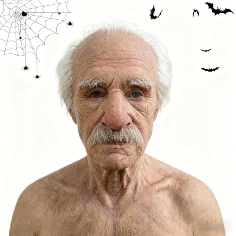 - Full head design with pale skin, wrinkles, and balding hair for authentic old man appearance.