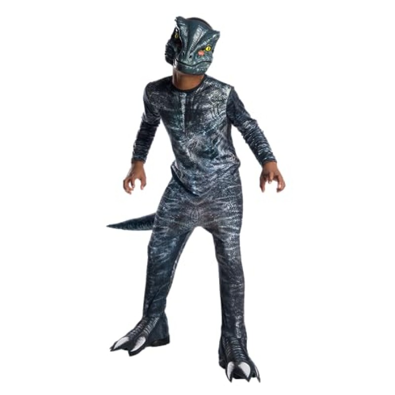 Step into the mysterious realm of prehistoric terror with this official Rubies Jurassic World: Fallen Kingdom Velociraptor costume, designed for children. Featuring a full-print jumpsuit complete with a menacing tail and a vacuform mask, it brings the legendary 'Blue' velociraptor to life just in time for a frightfully fun Halloween or themed party. Perfect for little explorers aged 8 to 10, this costume lets young spooks strut about with giant webbed feet while evoking the spine-tingling wonders of the dinosaur age.