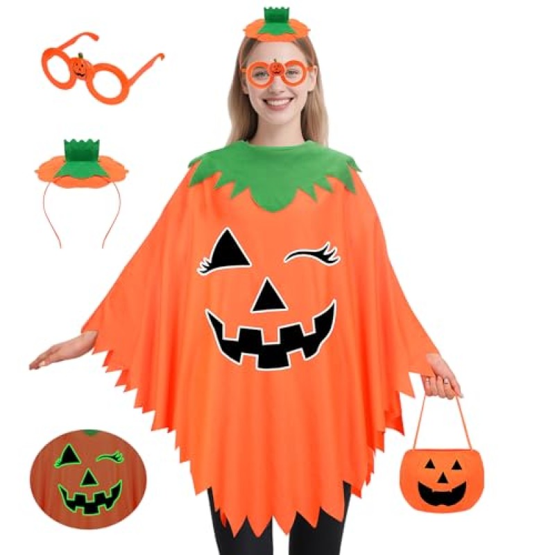 Unleash Your Halloween Spirit with This Adorable Pumpkin Costume Set! Get ready to light up the night with this festive and fun Halloween pumpkin outfit! Designed for women who love a hassle-free yet stunning costume, this all-in-one set includes a glowing pumpkin poncho, matching headband, playful glasses, and a trick-or-treat bag—so you can step into the Halloween vibe in seconds.