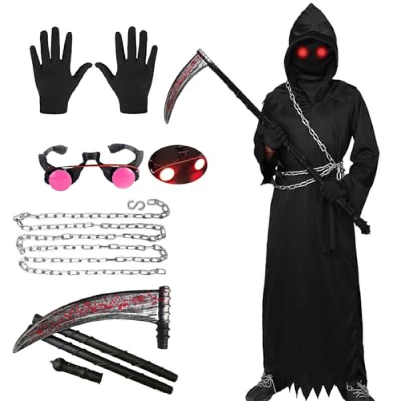 SERTAS Grim Reaper Halloween Costume for Boys with Glowing Red Eyes, 7-Piece Set