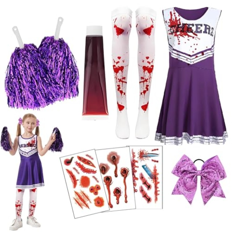 - 9-piece set including a purple cheerleader outfit, zombie accessories, and fake blood