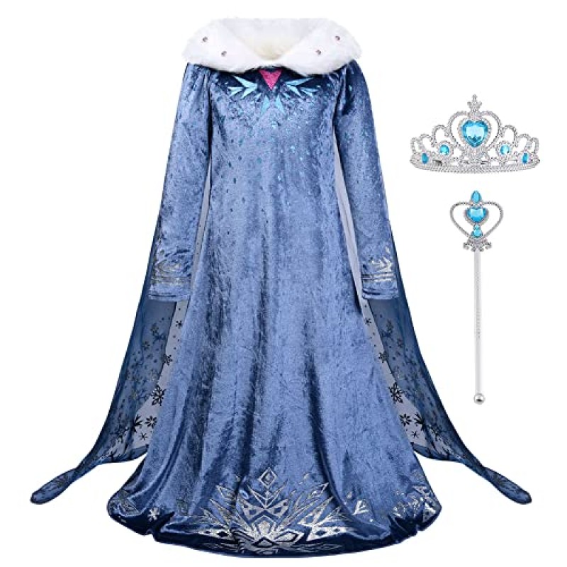 Transform your little one into a magical Snow Queen with this enchanting URAQT deluxe princess costume dress. Dressed in a shimmering blue velvet gown, draped with a long organza cape sprinkled with sparkling snowflakes, this costume conjures the chilly charm of a winter wonderland. The soft, skin-friendly fabric ensures comfort for nights filled with tricks, treats, or royal celebrations alike. Complete with a tiara and a magic wand, your child will feel ready to cast spells and rule the realm of fantasy. Perfect for Halloween, birthday parties, or any festive occasion where a touch of royal sparkle is desired, this dress invites hours of imaginative play under a spellbinding cloak of frost and fun.