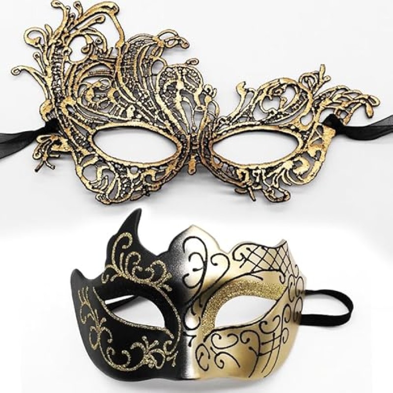 - Includes one gold lace mask for women and one black-and-gold painted mask for men, styled for a hauntingly chic couple’s look.